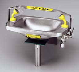 Aerated Eye Wash, Countertop^ Mounts into countertops up to 5cm thick. Features stainless steel receptor activated by stainless steel trigger bar; twin aerated outlets; stay-open ball valve; adjustable volume regulator; cutting and drilling template for installation. Meets ANSI Z358.1-1990 standard.