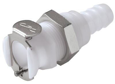 Quick Disconnect Coupling^ General-purpose grade. Valved body, 1/4 hose barb. Panel mount. Material: Polypropylene.