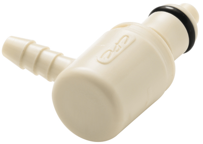 Quick Disconnect Coupling^ General-purpose grade. Valved insert, 1/8 hose barb elbow. Material: Polypropylene.