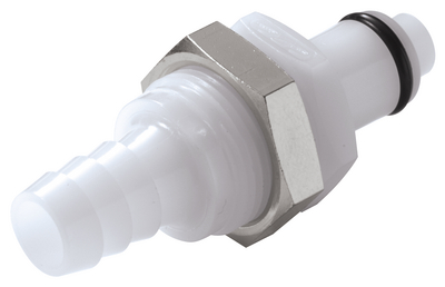 Quick Disconnect Coupling^ General-purpose grade. Valved insert, 3/8 hose barb. Panel mount. Material: Acetyl.
