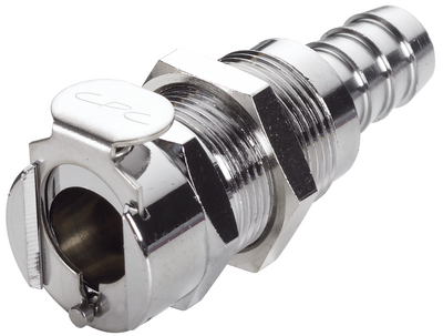 Quick Disconnect Coupling^ General-purpose grade. Valved body, 3/8 hose barb. Panel mount. Material: Chrome plated brass.