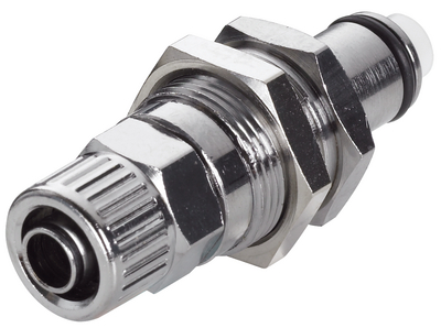 Quick Disconnect Coupling^ General-purpose grade. Valved insert, 3/8 poly tube compression nut. panel mount. Material: Chrome plated brass.