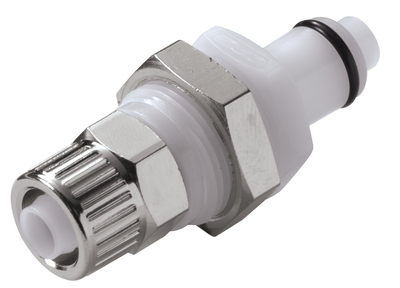 Quick Disconnect Coupling^ General-purpose grade. Valved insert, 3/8 poly tube compression nut. panel mount. Material: Acetyl.