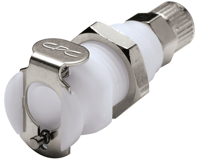 Quick Disconnect Coupling^ General-purpose grade. Body, 5/32 poly tube compression nut. Panel mount. Material: Acetyl.
