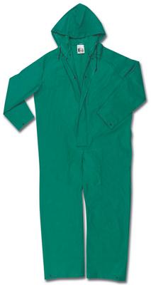 Coverall, 4X-Large^ One piece coverall features zipper front with double storm flap, attached hood with drawstring closure, 10 X 10 inch reinforced crotch and inner sleeves with elastic wrist closure. Inner pant cuffs. Green.