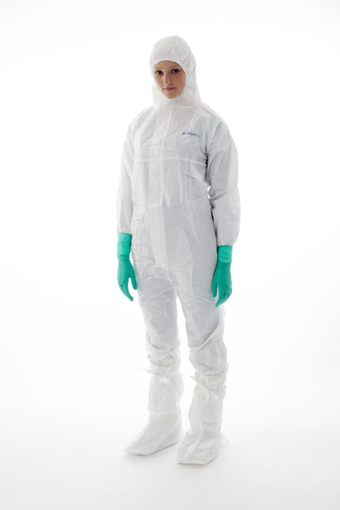 BioClean-D* Coverall with Hood 108-116cm XL^ BioClean-D* Coverall with Hood 108-116cm, Height: 182-188cm, Color White, disposable coverall featuring a front zip with protective flap, elasticated back, cuffs, face, ankles, and thumb loops to ensure a secure hold, comfort and protection, Size: XL