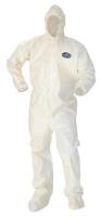HAZARD-GARD* II Coveralls^ For applications requiring chemical barrier protection. Durable, lightweight fabric, exterior laminated and seams taped with SARANEX* 23-P film. No seams in front. Zipper front, storm flap. Color: white. Level B/C. Elastic wrists and hood. Size: large.