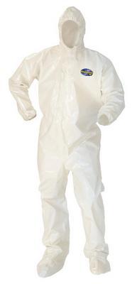 HAZARD-GARD* II Coveralls^ For applications requiring chemical barrier protection. Durable, lightweight fabric, exterior laminated and seams taped with SARANEX* 23-P film. No seams in front. Zipper front, storm flap. Color: white. Level B/C. Elastic wrists and hood. Size: x-large.