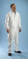 HD-ESD System Coveralls^ For ISO Class 4 cleanrooms. Polyester with carbon yarn stripe fabric. Raglan sleeves, zipper front, 2-ply reinforced placket, antistatic knit cuffs, and adjustable snaps at collar and ankles. Snaps for boot attachment. Gamma compatible. Autoclavable. White. 4X-Large.