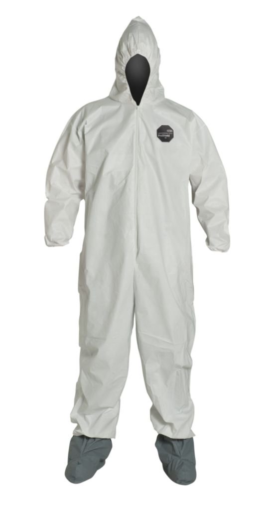 DuPont* ProShield* NexGen* Coveralls^ Disposable polypropylene coveralls protect against a variety of common industrial aerosols and liquids. Elastic wrists and ankles, attached hood and boots, serged seams, and front zipper closure. Bulk packed. White. Size: 5X-Large.
