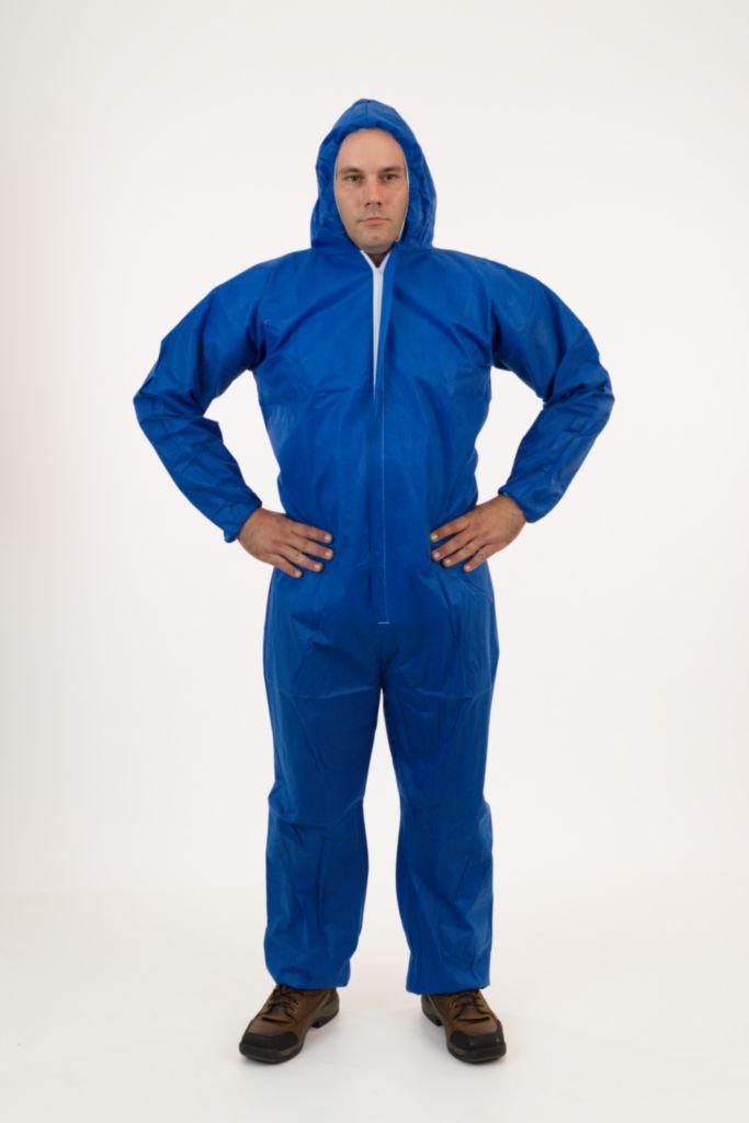 Blue Coverall^ Size: XXX-Large. SMS, 60g. Material offers splash resistance yet is comfortable to wear. Garments may be used for pharmaceutical and general industrial applications, manufacturing, asbestos removal, assembly operations. Zipper front, hood, elastic back/wrist/ankle.