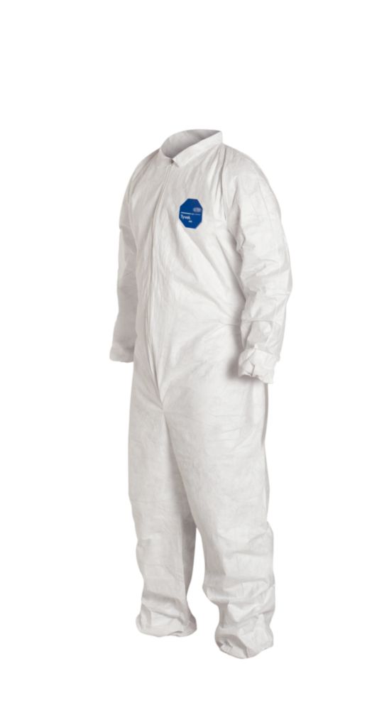 DuPont* Tyvek* Coverall^ Made from lightweight, tear-resistant, spunbonded olefin. Offers splash, dry-particulate, and bacteria protection. Disposable, low-linting coveralls feature generous cut, serged seams, collar, front zipper, and elastic wrists and ankles. Bulk packed. White. Size: Large.