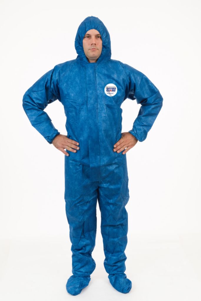Coverall Viroguard Hb 5Xl Cs25^ Viroguard blue hood and boot coverall, with elastic wrist and back, zipper front with storm flap. passes astm 1670/1671 testing for blood, body fluids, and blood-bourne pathogens. 25 per case