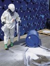 HAZARD-GARD* II Coveralls^ For applications requiring chemical barrier protection. Durable, lightweight fabric, exterior laminated and seams taped with SARANEX* 23-P film. No seams in front. Zipper front, storm flap. Color: white. Level B/C. Attached boots. Elastic wrists and hood. Size: 3x-large.