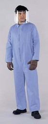 PREVAIL* Flame-Resistant Coveralls^ Zipper front and elastic wrists, ankles, and hood. Designed to be worn in areas where there is exposure to sparks. Made from a special spunlace nonwoven fabric treated with a flame-resistant finish. NFPA 701 and NFPA 99 compliant. Blue. Medium.