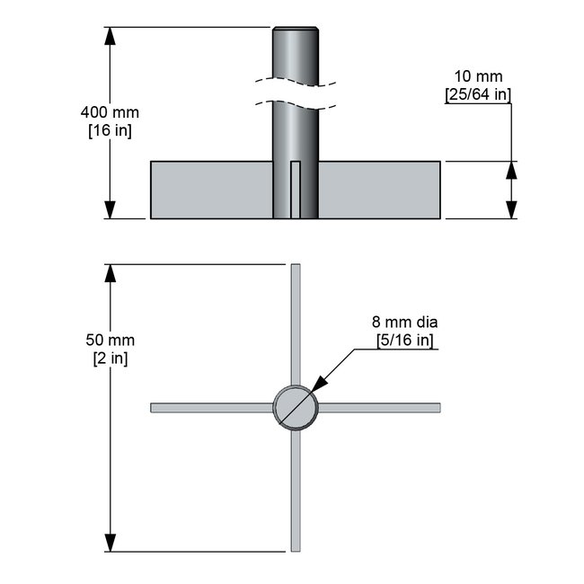 Electro-polished stainless steel 316LWelded to shaftVery high shear with high vortexing characteristicsWill vortex 5 gallons of water at 900 rpmShaft length, 16 in. (400mm); 5/16 in. diameter (8mm). Impeller is 2 × 2 in. (5.0 × 5.0cm). Weight 0.3 lbs (128g)High speed; Low viscosity mixing; Radial flow pattern.