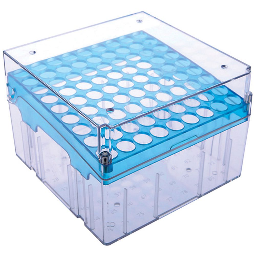 Magne-Box* Magnetic Polycarbonate Cryo-Box 81-Place^ Magne-Box* Magnetic Polycarbonate Cryo-Box, 81-Place, color: Blue, Dimensions: 5 1/4 x 5 1/4 x 3 3/4 in, feature magnets that securely connect the base to the hinged lid, This allows for one handed retrieval from freezer racks, samples stay safe