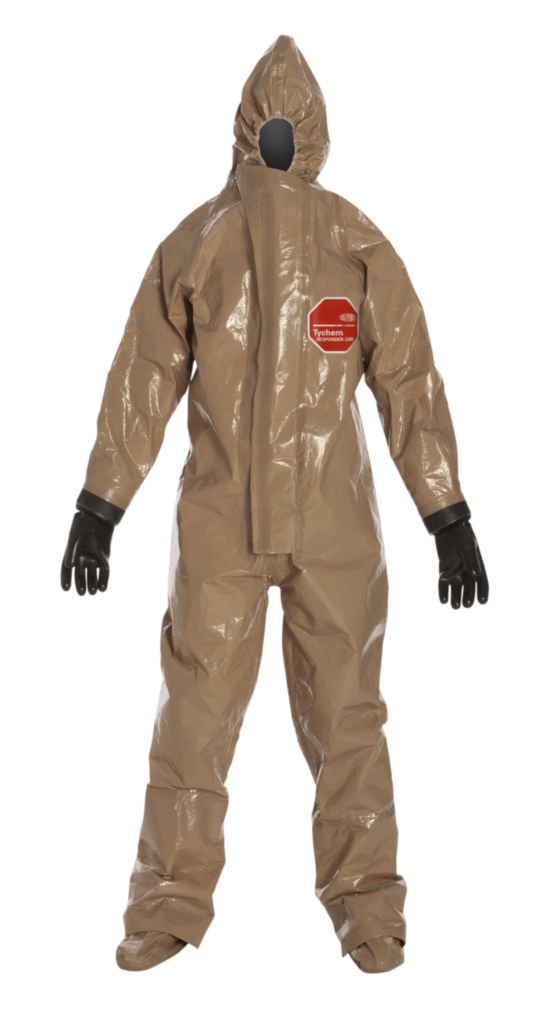 DuPont* Tychem* Responder* CSM Coverall^ High-level protection against heavy aerosols, liquid spray/splash, hazardous gases. Made to military specs. Coverall features double taped seams, attached hood and sock boots, front zipper, double storm flap, attached butyl gloves, boot flaps. Tan. XX-Large.