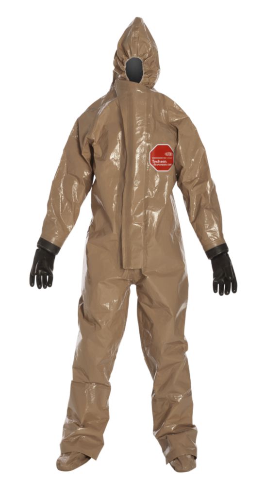 DuPont* Tychem* Responder* CSM Coverall^ High-level protection against heavy aerosols, liquid spray/splash, hazardous gases. Made to military specs. Coverall features double taped seams, attached hood and sock boots, front zipper, double storm flap, attached butyl gloves, boot flaps. Tan. Small.