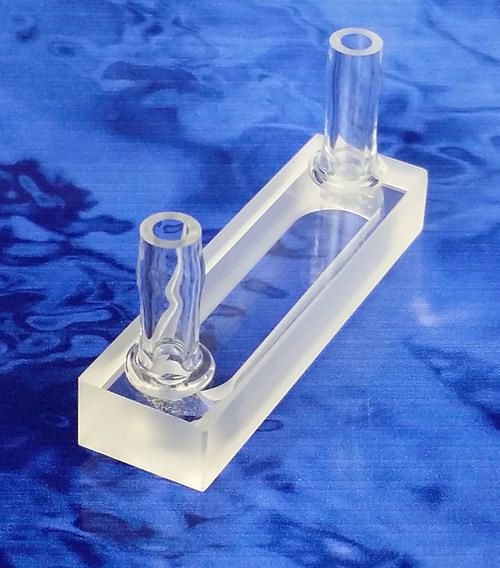 Flow Through Cell with Side Tube Type 48 0.1mm^ Flow Through Cell with Side Tube Type 48, Lightpath: 0.1mm, Material: IR Quartz, Outer Length: 2.6mm, Outer Width: 12.5mm, Outer Height: 45.0mm, Chamber Length: 0.1mm, Chamber Width: 9.0mm, Chamber Height: 38.0mm, Two windows polished, Capacity: 30ul