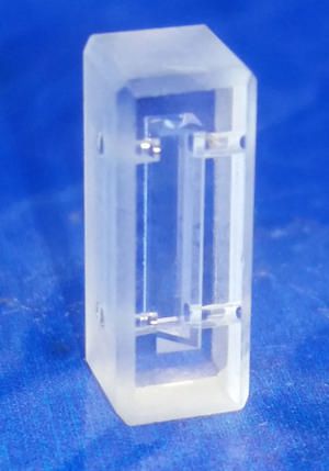 Refractometer Flow Cell Type 510^ Refractometer Flow Cell Type 510, Material: UV Quartz, Outer Length: 5mm, Outer Width: 4.8mm, Outer Height: 12.7mm, Chamber Length: 2x1.6mm, Chamber Width: 2x1.6mm, Contains two equal-volumed chambers, Two windows and inner chamber, Capacity: 2x10ul