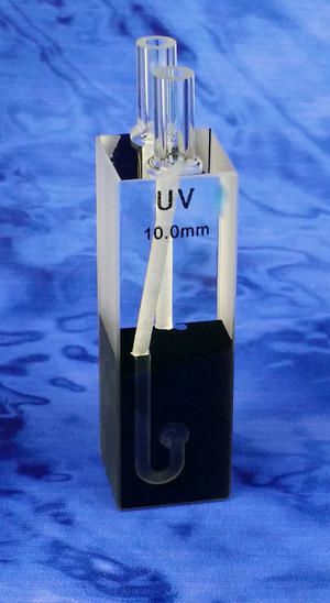 Sub-Micro Black Flow Through Cell Type 513M 10mm^ Sub-Micro Black Flow Through Cell Type 513M, Lightpath: 10mm, Material: Black IR Quartz, Outer Length: 12.5mm, Outer Width: 12.5mm, Outer Height: 38.0mm, Chamber Length: 10mm, Chamber Width: 3.0mm, Z-Dimension: 8.5mm, Capacity: 70ul