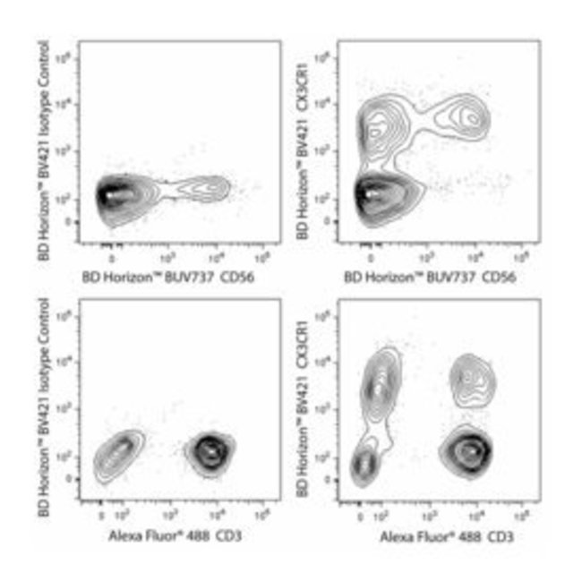 The 2A9-1 monoclonal antibody specifically binds to human CX3CR1, which is also known as chemokine (C-C) receptor-like 1 (CCRL1), Beta chemokine receptor-like 1 (CMK-BRL-1), G protein-coupled receptor 13 (GPR13), or GPRV28 (V28). CX3CR1 is a seven transmembrane G protein coupled receptor that is expressed by NK cells, T cells, and monocytes. The cellular expression of CX3CR1 is correlated with high levels of intracellular perforin and granzyme B. CX3CR1 serves as a receptor for fractalkine (CX3CL1). Fractalkine is a transmembrane chemokine of the CX3C family that is expressed on activated endothelial cells, neurons, and astrocytes. Interaction of CX3CR1 with fractalkine initiates cellular adhesive and chemotactic responses. The antibody was conjugated to BD Horizon BV421 which is part of the BD Horizon Brilliant™ Violet family of dyes. With an Ex Max of 407-nm and Em Max at 421-nm, BD Horizon BV421 can be excited by the violet laser and detected in the standard Pacific Blue™ filter set (eg, 450/50-nm filter). BD Horizon BV421 conjugates are very bright, often exhibiting a 10 fold improvement in brightness compared to Pacific Blue conjugates.