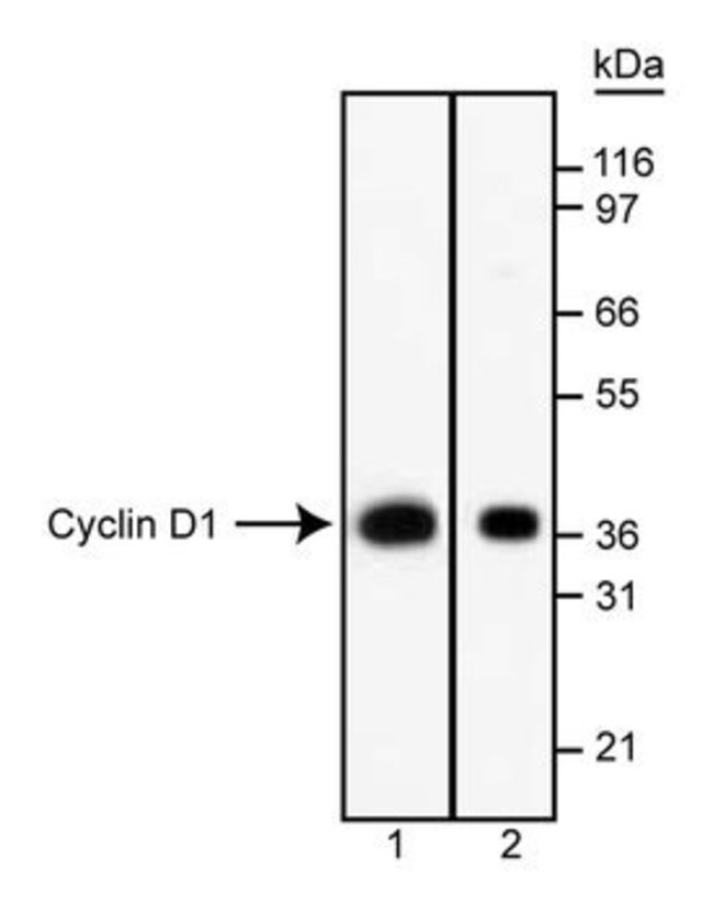 Cyclins and cyclin-dependent kinases (cdks) are evolutionarily conserved proteins that are essential for cell-cycle control in eukaryotes. Cyclins contain a conserved amino acid sequence motif, the cyclin box, which allows their binding to cdks to form active complexes that regulate the progression of the cell cycle. The synthesis and degradation of cyclins is tightly controlled in a cell cycle specific manner. Several classes of cyclins (A-E) have been described. Cyclins have been placed into functional groups as follows: Group 1 (cyclins A, B, D1, D2, D3, E and F) functions primarily in cell cycle reguation; Group 2 (cyclins C and H) also plays a role in transcriptional regulation; Group 3 (cyclins G1, G2 and I) may play a role distinct from other cyclins. Specific substrates for cyclin-cdk complexes include nuclear lamins, histones, oncogenes (c-src, c-abl, SV40 large-T Ag), tumor suppressor genes (Rb and p53), and others. The D-type cyclins are involved in regulating the passage of mammalian cells through G1. The reduced molecular weights of cyclin D1 is ∽36kda. G124-326 recognizes human cyclin D1 and cross-reacts with the mouse homolog (Cyl1) of human cyclin D1. It does not cross-react with human cyclins D2 and D3. Recombinant full-length human cyclin D1 was used as immunogen.Host Species: MouseClone: G124-326Isotype: IgG1Species Reactivity: HumanImmunogen: Recombinant full-length human cyclin D1Formula Weight [Chemical]: 36kDaFlow Cytometry, Immunoprecipitation, Western Blotting