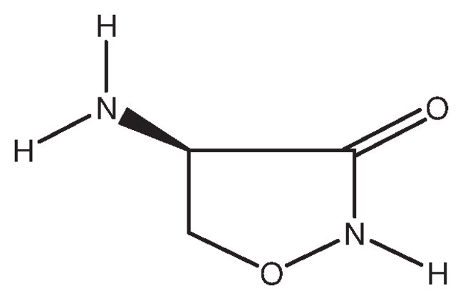 D-Cycloserine, CAS # 68-41-7, is a cyclic amino acid analog of D-alanine, originally isolated from Streptomyces species. It is synthetically formulated and exhibits antibiotic properties through its inhibition of bacterial cell wall synthesis.