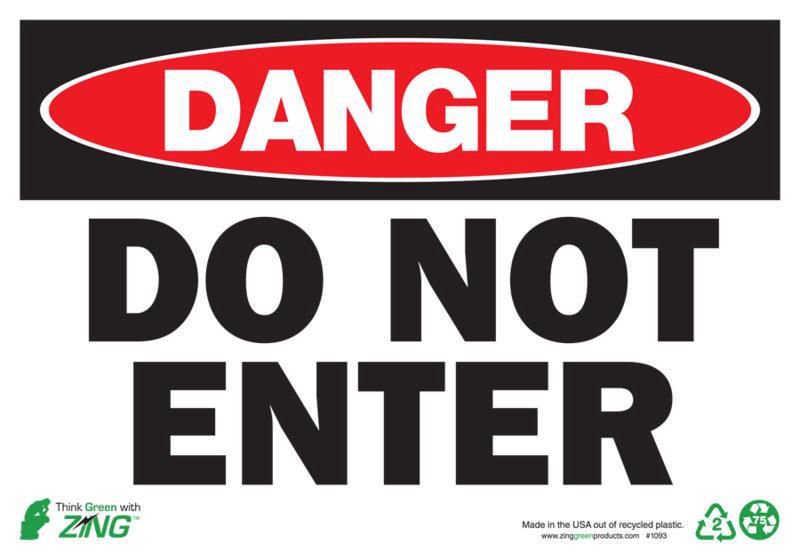 Sign Danger Do Not Plastic Zing 10X14In^ Danger Sign, Recycled Plastic, Do Not Enter, Pre-Drilled Mounting Holes & Adhesive Tabs, Impact And Uv Resistant, Ul Validated For Recycled Content, 10X14I