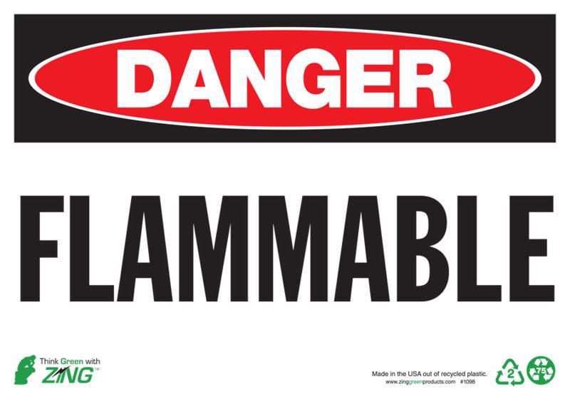 Sign Danger Flammable Plastic 10X14In^ Danger Sign, Recycled Plastic, Flammable, Pre-Drilled Mounting Holes & Adhesive Tabs, Impact And Uv Resistant, Ul Validated For Recycled Content, 10X14I