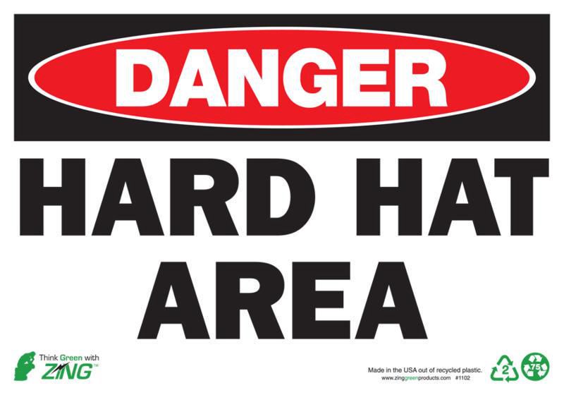 Sign Danger Hard Hat Plastic 10X14In^ Danger Sign, Recycled Plastic, Hard Hat Area, Pre-Drilled Mounting Holes & Adhesive Tabs, Impact And Uv Resistant, Ul Validated For Recycled Content, 10X14I