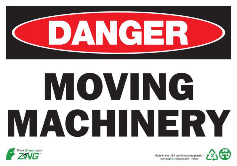 Sign Danger Moving Machinery Plastic 7X10In^ Danger Sign, Recycled Plastic, Moving Machinery, Pre-Drilled Mounting Holes & Adhesive Tabs, Impact And Uv Resistant, Ul Validated For Recycled Content, 7X10I