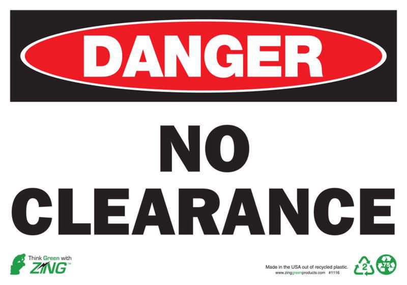 Sign Danger No Clearance Plastic 10X14In^ Danger Sign, Recycled Plastic, No Clearance, Pre-Drilled Mounting Holes & Adhesive Tabs, Impact And Uv Resistant, Ul Validated For Recycled Content, 10X14I
