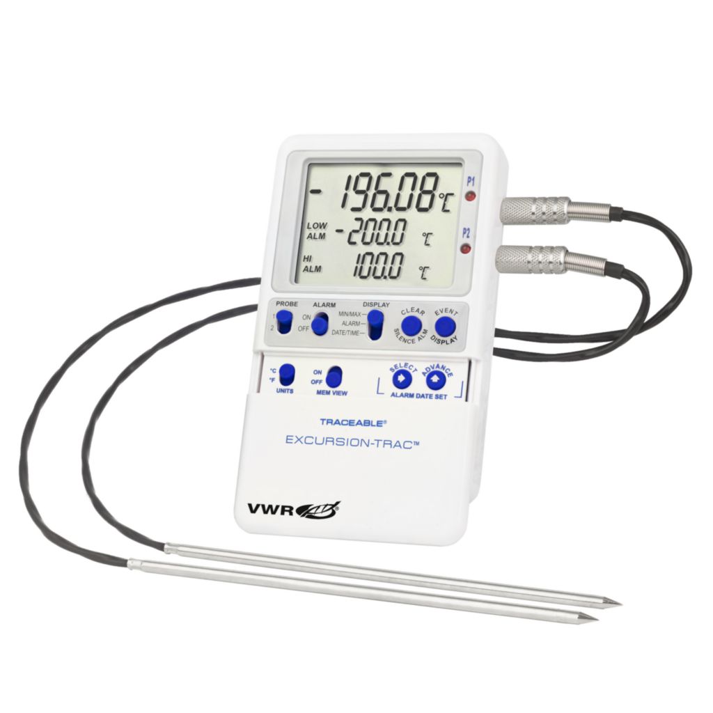 These Traceable® Excursion-Trac™ USB Datalogging LN2 thermometers monitor the temperature in the liquid nitrogen Dewars, covering cryogenic needs for sensitive, irreplaceable biological samples., Hi/Lo alarms and time/date stamps: Alarm tracking feature stores in memory each alarm event detailing when the alarm state occurred, as well as when the unit returned back to within range., 04_BodyText: Smart-Alarm™ signals out-of-range conditions: When an out-of-range condition is sensed, the Smart-Alarm™ triggers. Smart-Alarm™ features visual and audible indicators which signal continuously until acknowledged, even if the parameter returns to the non-alarm range., 05_BodyText: USB data transfer: This liquid nitrogen temperature monitor allows recorded data, in a CSV format, to be transferred from the thermometer to PC/Mac with a USB flash drive (not included). Specific software is not needed for this thermometer and data can be deleted from memory. Each device has a unique ID that allows multiple units to be used in the same location., 06_BodyText: Datalogging features: Monitor readings overnight, on weekends, or for any time period with rolling data log. User-defined datalogging interval of one observation/minute to one observation/24 hours. Memory capacity maintains 1 year of recorded data when using 1 minute intervals and longer when using larger intervals. After transferring the data onto a USB stick, it can be cleared from memory on the base unit., 07_BodyText: Alarm state indicators include visual LEDs, audio alerts, and flashing LCD segments. Data for up to 10 different alarm events can be retrieved with the most current event viewable on the display. Highly accurate and reliable., 02_BulletPoint: Liquid Nitrogen USB datalogging thermometers with user-defined time intervals | Memory capacity of 525600 temperature observations and one year when using one minute intervals | Four calibration points (–196 °C, –80 °C, 0 °C, and 100 °C) with cable length of 10' | Recorded data (CSV file) may be transferred from base unit to PC or Mac using a USB flash drive, with no additional software needed | Smart-Alarm™ features a visual/audible alarm that continues to alarm even if unit returns to non-alarm conditions | Monitors readings for any period of time | Status indicators: low battery, data downloading status, flashing LCD symbols, and audio alarm indicating active alarms, 08_Certifications: CE marked. RoHS compliant. Traceable to NIST for accuracy. Multi-point calibration on an individually-numbered Traceable® certificate which assures accuracy from an ISO/IEC 17025:2005 (1750.01) calibration laboratory accredited by A2LA. It indicates traceability of measurements to the SI units through NIST or other recognized national measurement institutes (NMI) that are signatories to the CIPM mutual recognition agreement., 10_Ordering: Units are supplied with stainless steel probe/probes, universal AC adaptor, wall mount, Velcro®, magnetic strips, batteries, and an ISO 17025 Traceable® Certificate., Resolution: T: 0.01 °C, Interface: USB, These Traceable® Excursion-Trac™ USB Datalogging LN2 thermometers monitor the temperature in the liquid nitrogen Dewars, covering cryogenic needs for sensitive, irreplaceable biological samples., Hi/Lo alarms and time/date stamps: Alarm tracking feature stores in memory each alarm event detailing when the alarm state occurred, as well as when the unit returned back to within range., 04_BodyText: Smart-Alarm™ signals out-of-range conditions: When an out-of-range condition is sensed, the Smart-Alarm™ triggers. Smart-Alarm™ features visual and audible indicators which signal continuously until acknowledged, even if the parameter returns to the non-alarm range., 05_BodyText: USB data transfer: This liquid nitrogen temperature monitor allows recorded data, in a CSV format, to be transferred from the thermometer to PC/Mac with a USB flash drive (not included). Specific software is not needed for this thermometer and data can be deleted from memory. Each device has a unique ID that allows multiple units to be used in the same location., 06_BodyText: Datalogging features: Monitor readings overnight, on weekends, or for any time period with rolling data log. User-defined datalogging interval of one observation/minute to one observation/24 hours. Memory capacity maintains 1 year of recorded data when using 1 minute intervals and longer when using larger intervals. After transferring the data onto a USB stick, it can be cleared from memory on the base unit., 07_BodyText: Alarm state indicators include visual LEDs, audio alerts, and flashing LCD segments. Data for up to 10 different alarm events can be retrieved with the most current event viewable on the display. Highly accurate and reliable., 02_BulletPoint: Liquid Nitrogen USB datalogging thermometers with user-defined time intervals | Memory capacity of 525600 temperature observations and one year when using one minute intervals | Four calibration points (–196 °C, –80 °C, 0 °C, and 100 °C) with cable length of 10' | Recorded data (CSV file) may be transferred from base unit to PC or Mac using a USB flash drive, with no additional software needed | Smart-Alarm™ features a visual/audible alarm that continues to alarm even if unit returns to non-alarm conditions | Monitors readings for any period of time | Status indicators: low battery, data downloading status, flashing LCD symbols, and audio alarm indicating active alarms, 08_Certifications: CE marked. RoHS compliant. Traceable to NIST for accuracy. Multi-point calibration on an individually-numbered Traceable® certificate which assures accuracy from an ISO/IEC 17025:2005 (1750.01) calibration laboratory accredited by A2LA. It indicates traceability of measurements to the SI units through NIST or other recognized national measurement institutes (NMI) that are signatories to the CIPM mutual recognition agreement., 10_Ordering: Units are su