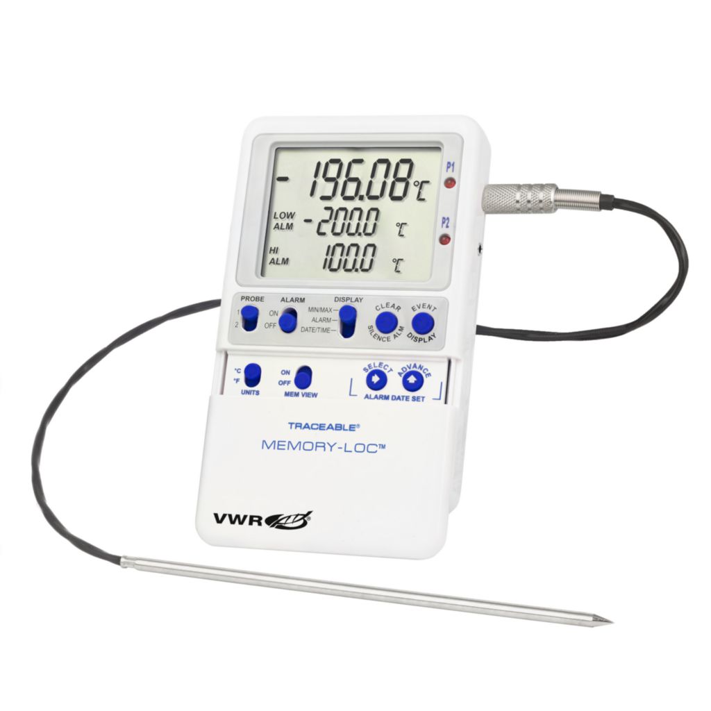 Resolution: T: 0.01 °C, Interface: USB, Covering cryogenic needs for sensitive, irreplaceable biological samples., Hi/Lo alarms and time/date stamps: Alarm tracking feature stores in memory each alarm event detailing when the alarm state occurred, as well as when the unit returned back to within range., 04_BodyText: Smart-Alarm™ Signals out-of-range conditions: When an out-of-range condition is sensed, the Smart-Alarm™ triggers. Smart-Alarm™ features visual and audible indicators which signal continuously until acknowledged, even if the parameter returns to the non-alarm range., 05_BodyText: USB data transfer: This liquid nitrogen temperature monitor allows recorded data, in a CSV format, to be transferred from the thermometer to PC/Mac with a USB flash drive (not included). Specific software is not needed for this thermometer and data can be deleted from memory. Each device has a unique ID that allows multiple units to be used in the same location. This device can be used by organizations that must adhere to distribution adhering to USP 1083, and it is especially useful for transportation monitoring., 06_BodyText: Datalogging features: Monitor readings overnight, on weekends, or for any time period with rolling data log. User-defined datalogging interval of one observation/minute to one observation/24 hours. Memory capacity maintains 2 years of recorded data when using 1 minute intervals and longer when using larger intervals., 07_BodyText: Alarm state indicators include visual LEDs, audio alerts, and flashing LCD segments. Data for up to 10 different alarm events can be retrieved with the most current event viewable on the display. High accurate and reliable. Indicator light will appear when memory is 95%. Unable to delete data from memory once stored. Allows user-defined logging interval from every minute to every 24 hours. Over one million temperature observations., 02_BulletPoint: Liquid nitrogen USB datalogging thermometers that can be used in 21 CFR 11 environments | Memory capacity of 525500 temperature observations | Four calibration points (–196, –80, 0, and 100 °C) | Recorded data (CSV file) may be transferred from base unit to PC or Mac using a USB flash drive, with no additional software needed | Smart-Alarm™ features a visual/audible alarm that continues to alarm even if unit returns to non-alarm conditions | Monitors readings for any period of time | Status indicators: low battery, data downloading status, flashing LCD symbols, and audio alarm indicating active alarms, 08_Certifications: CE marked. RoHS compliant. Traceable to NIST for accuracy. Multi-point calibration on an individually-numbered Traceable® certificate which assures accuracy from an ISO/IEC 17025:2005 (1750.01) calibration laboratory accredited by A2LA. It indicates traceability of measurements to the SI units through NIST or other recognized national measurement institutes (NMI) that are signatories to the CIPM mutual recognition agreement., 10_Ordering: Units are supplied with probe/probes, universal AC adaptor, wall mount, Velcro®, magnetic strips, batteries, and an ISO 17025 Traceable® Certificate., Sensor: 1 stainless steel 316 sensor with 10" cable and platinum RTD sensor, Weight: 113 g, W×D×H: 108×70×19 mm (4.25×2.75×0.75"), Cat. No.: 76047-588, Accuracy: T: ±0.25 °C, Range: T: –196… 105 °C (–328… 221 °F), Resolution: T: 0.01 °C, Interface: USB, Covering cryogenic needs for sensitive, irreplaceable biological samples., Hi/Lo alarms and time/date stamps: Alarm tracking feature stores in memory each alarm event detailing when the alarm state occurred, as well as when the unit returned back to within range., 04_BodyText: Smart-Alarm™ Signals out-of-range conditions: When an out-of-range condition is sensed, the Smart-Alarm™ triggers. Smart-Alarm™ features visual and audible indicators which signal continuously until acknowledged, even if the parameter returns to the non-alarm range., 05_BodyText: USB data transfer: This liquid nitrogen temperature monitor allows recorded data, in a CSV format, to be transferred from the thermometer to PC/Mac with a USB flash drive (not included). Specific software is not needed for this thermometer and data can be deleted from memory. Each device has a unique ID that allows multiple units to be used in the same location. This device can be used by organizations that must adhere to distribution adhering to USP 1083, and it is especially useful for transportation monitoring., 06_BodyText: Datalogging features: Monitor readings overnight, on weekends, or for any time period with rolling data log. User-defined datalogging interval of one observation/minute to one observation/24 hours. Memory capacity maintains 2 years of recorded data when using 1 minute intervals and longer when using larger intervals., 07_BodyText: Alarm state indicators include visual LEDs, audio alerts, and flashing LCD segments. Data for up to 10 different alarm events can be retrieved with the most current event viewable on the display. High accurate and reliable. Indicator light will appear when memory is 95%. Unable to delete data from memory once stored. Allows user-defined logging interval from every minute to every 24 hours. Over one million temperature observations., 02_BulletPoint: Liquid nitrogen USB datalogging thermometers that can be used in 21 CFR 11 environments | Memory capacity of 525500 temperature observations | Four calibration points (–196, –80, 0, and 100 °C) | Recorded data (CSV file) may be transferred from base unit to PC or Mac using a USB flash drive, with no additional software needed | Smart-Alarm™ features a visual/audible alarm that continues to alarm even if unit returns to non-alarm conditions | Monitors readings for any period of time | Status indicators: low battery, data downloading status, flashing LCD symbols, and audio alarm indicating active alarms, 08_Certifications: CE marked. RoHS compliant. Traceable to NIST fo