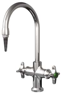 Hot and Cold Water Mixing Gooseneck Faucet^ Deck mounted. Chrome plated brass. 15.2cm spread with removable straight serrated hose connector. Includes 3.3cm diameter threaded shank, locknut, washer and 1.27cm OD slip joint inlets. CSA certified. Complies with ANSI/ASME A112.18.1M.