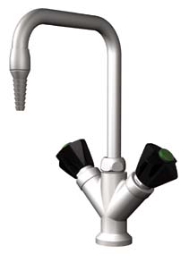 Deck Mounted Laboratory Mixing Faucet^ White epoxy-coated brass. 15.2cm gooseneck. Valves have self-contained renewable units with replaceable stainless steel seats. Black nylon hooded handle with color-coded index buttons. CSA certified. Meets ANSI/ASME A112.18.1M requirements.