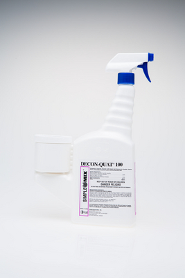 DECON-QUAT 100^ DECON-QUAT 100 is an effective bactericide, virucide, deodorizer, disinfectant, Quaternary Ammonium with a phosphate free formulation, RTU 16 oz SimpleMix for easy use dilution with a push of a button and swirl with WFI. Filtered at 0.2um, Single Bagged. Size: 16oz