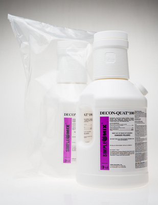 DECON-QUAT 100* Quaternary Ammonium Solution^ Broad spectrum hospital disinfectant, fungicide, deodorizer, and more. Effective against Hepatitis B Virus. Filtered at 0.2u. SimpleMix* system 2:128 in 3.8L of WFI water. Gamma irradiated. Double-bagged. Traceable. Validated for sterility, shelf life.