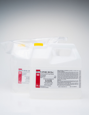DECON-SPORE 200 Plus* Sterile Disinfectant^ Stabilized mixture of peracetic acid and hydrogen peroxide for sterilization of manufacturing, packaging, and filling equipment in aseptic processes. Aseptically filtered at 0.2u. Lot specific Certificates of Analysis and Sterility provided. Size: 3.78L.