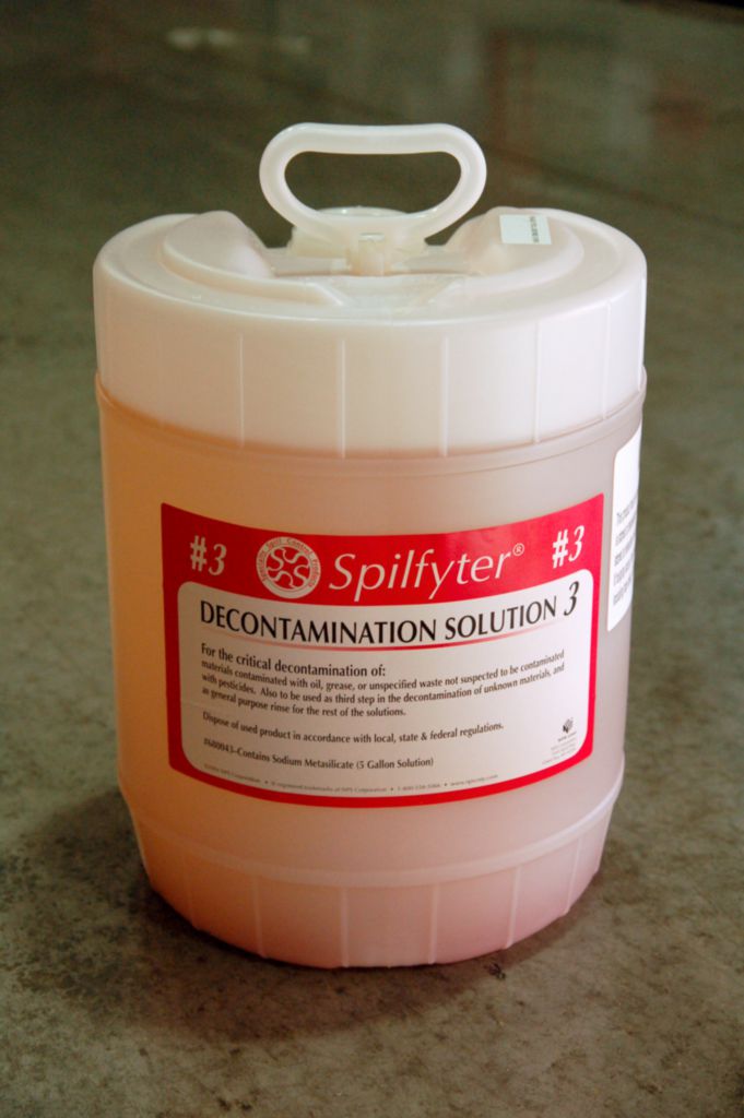 Decontamination Spill Kit^ Use as general purpose rinse for Decons 1 and 2. Contains Decon 3 solution; 208L poly drum; 2 poly sprayers; poly sheeting; 3 wash brushes; 6 hazmat socks; 32oz. shaker bottle; pH paper roll; nitrile gloves; splash goggles; disposal bag; containment pond and instructions.