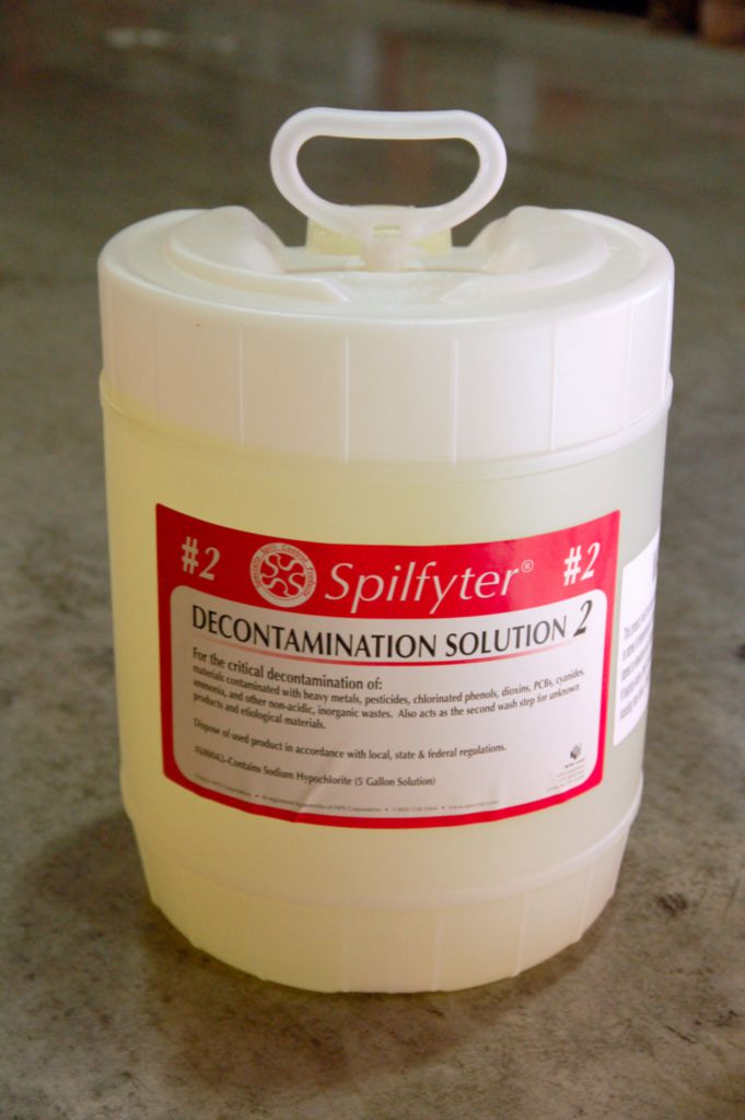 Decon 2^For unknown contaminants such as heavy-metals, dioxins. Designed for decontamination of personal protective equipment, tools and surfaces at hazardous material incidences or waste sites. Decontamination solutions require no dilution and are phosphate free. Not for use on skin.