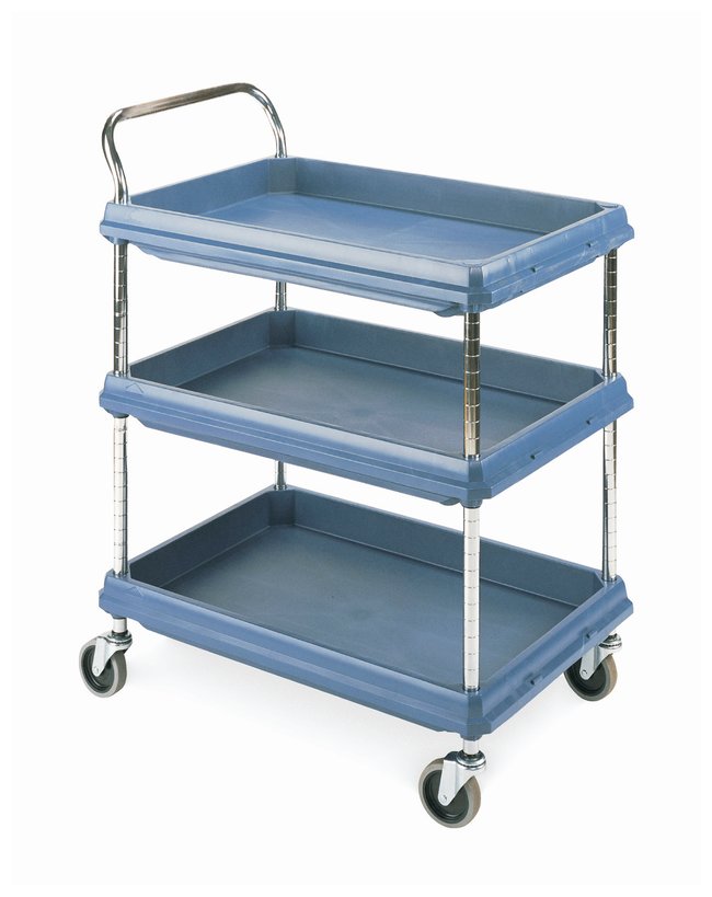 Rugged mobile carts for wide variety of uses. High-density polypropylene shelves offer superior corrosion and chemical resistance. Shelves are mounted on a chrome-plated frame.Capacity:150 lb. per shelf (68kg); 400 lb. maximum cart load (181kg)Corrosion-proof polymer shelvesRaised shelf edges contain spillsErgonomic handleSmooth surfaces resist staining and wipe clean easilyCarts roll easily on four 4“ swivel castersEasy, no-tool assembly (ships flat)Choose BC Series or Deep Ledge Series Carts BC Series shelves feature 0.5 in. raised ship's edge designDeep Ledge Series shelves feature a deeper 2.75 in. ledge for better spill containmentThree-shelf models feature a center shelf that adjusts in 1 in. increment