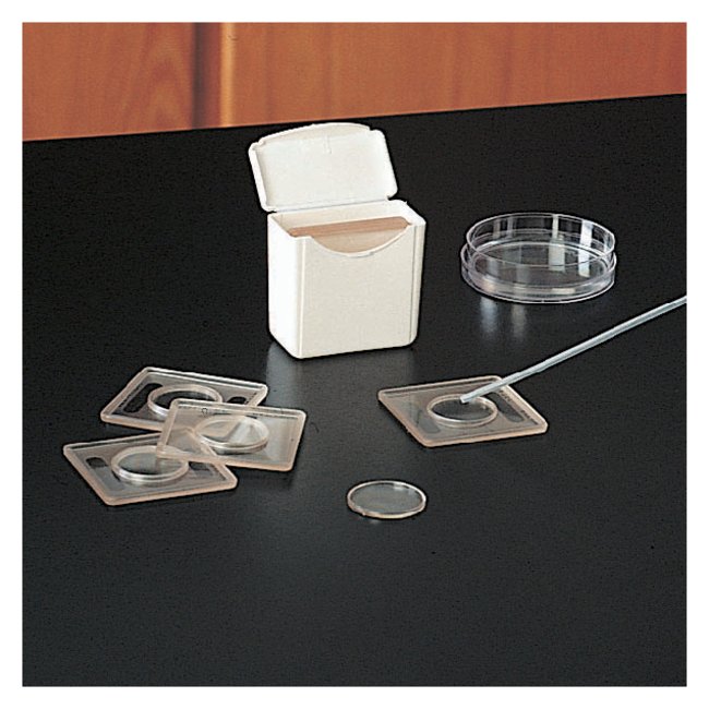 Slides hold live aquatic specimens in the well and permit students to view them under a microscope or by means of a 35mm or overhead projector. Chemistry students can view crystal formation.