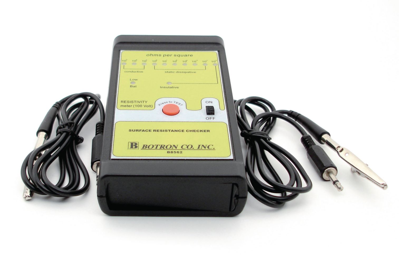 Deluxe Surface Resistivity Tester 100V^ Deluxe Surface Resistivity Tester, Led: 10 Lights, Low Battery: Led Light, Battery: 9 V, Electrodes: Two Parallel, Ground Leads: Two, Test Voltage: 100 Volts, Size: 5.5In X 2.75In X 1In, Accuracy Range: /- 10%, Portable, Easy To Read, Led Light Indicator