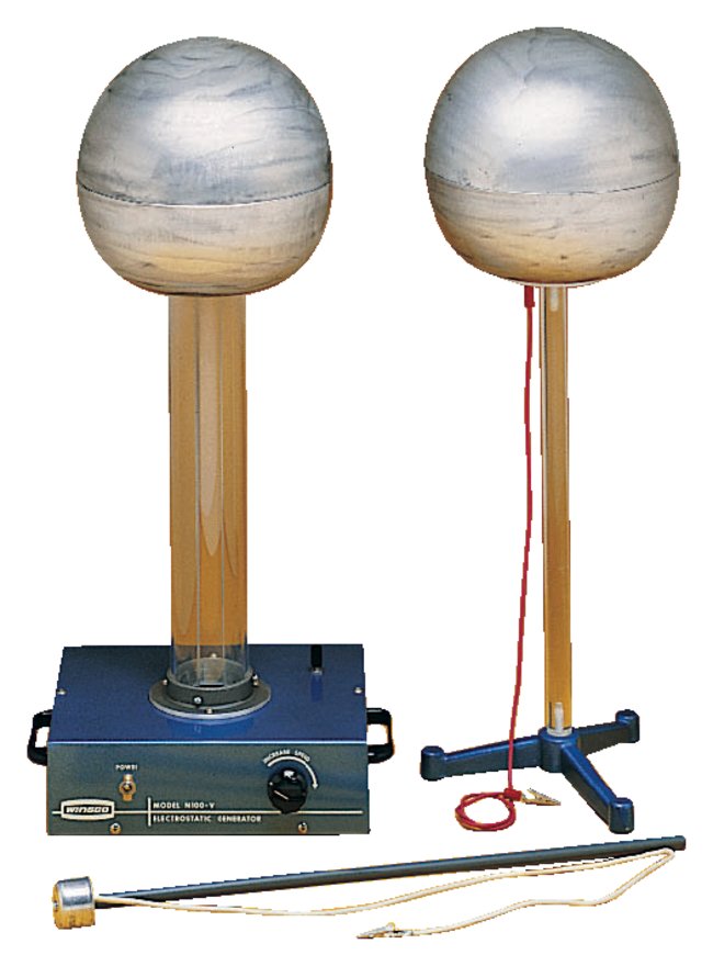 A first-rate apparatus for demonstrating static electricity.Generates potentials as high as 400,000 voltsProduces sparks as long as 15 in. (38cm) Belt current charges the dome at 10μAOperates on 110VAC with grounded cord Replacement belts are availableRotary Dial:Located in the unit's base Allows you to vary the motor's speedTerminal:Located on the 9.8 × 11.8 in. (25 × 30cm) baseGrounded to safely produce sparks and discharge the domeAluminum Electrode:Highly polished and anodized9.8 in. (25cm) diameterSupported by a sturdy, insulated, polycarbonate columnAluminum Sphere:9.8 in. (25cm) diameterCreates sparks of greater intensityMounted on a Lucite™ rod with a metal baseOverall height: 29.9 in. (76cm)