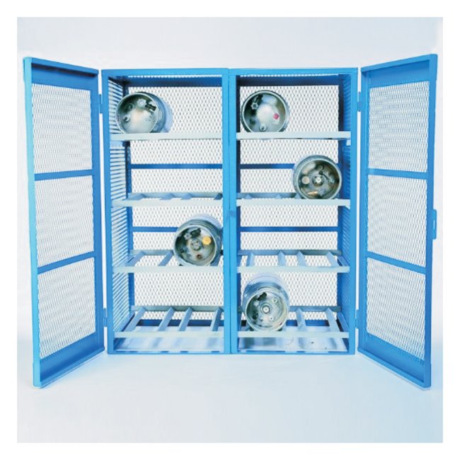 Open steel mesh from sturdy expanded metal construction prevents gases from accumulatingSolid welded angle frame construction provides years of serviceCages are easily relocatedOrder InfoShipped fully assembledComplianceConstruction provides compliance with NFPA codes and OSHA regulatio