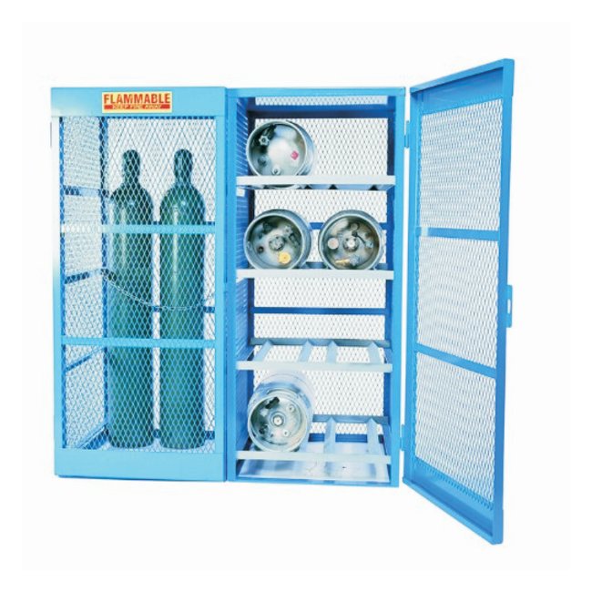 Open steel mesh from sturdy expanded metal construction prevents gases from accumulatingSolid welded angle frame construction provides years of serviceCages are easily relocatedOrder InfoShipped fully assembledComplianceConstruction provides compliance with NFPA codes and OSHA regulatio