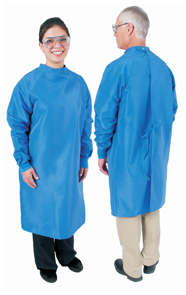 Closed Back Gown with One Piece Seamless Front and High Neck Coverage provides Employees Front and Back Level 2 Protection from Incidental splash of Blood, Body Fluids, Aerosols, etc.; Air Permeability 12 CFM, Stain Resistant, Anti-static fabric; Durable Construction; 225 Commercial wash tested.